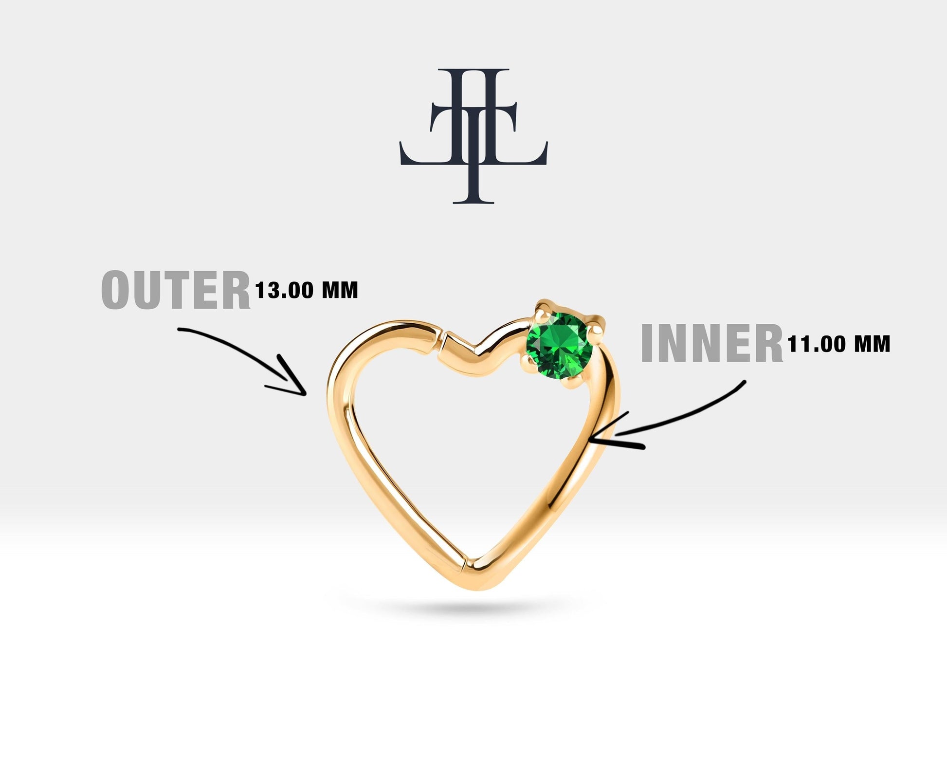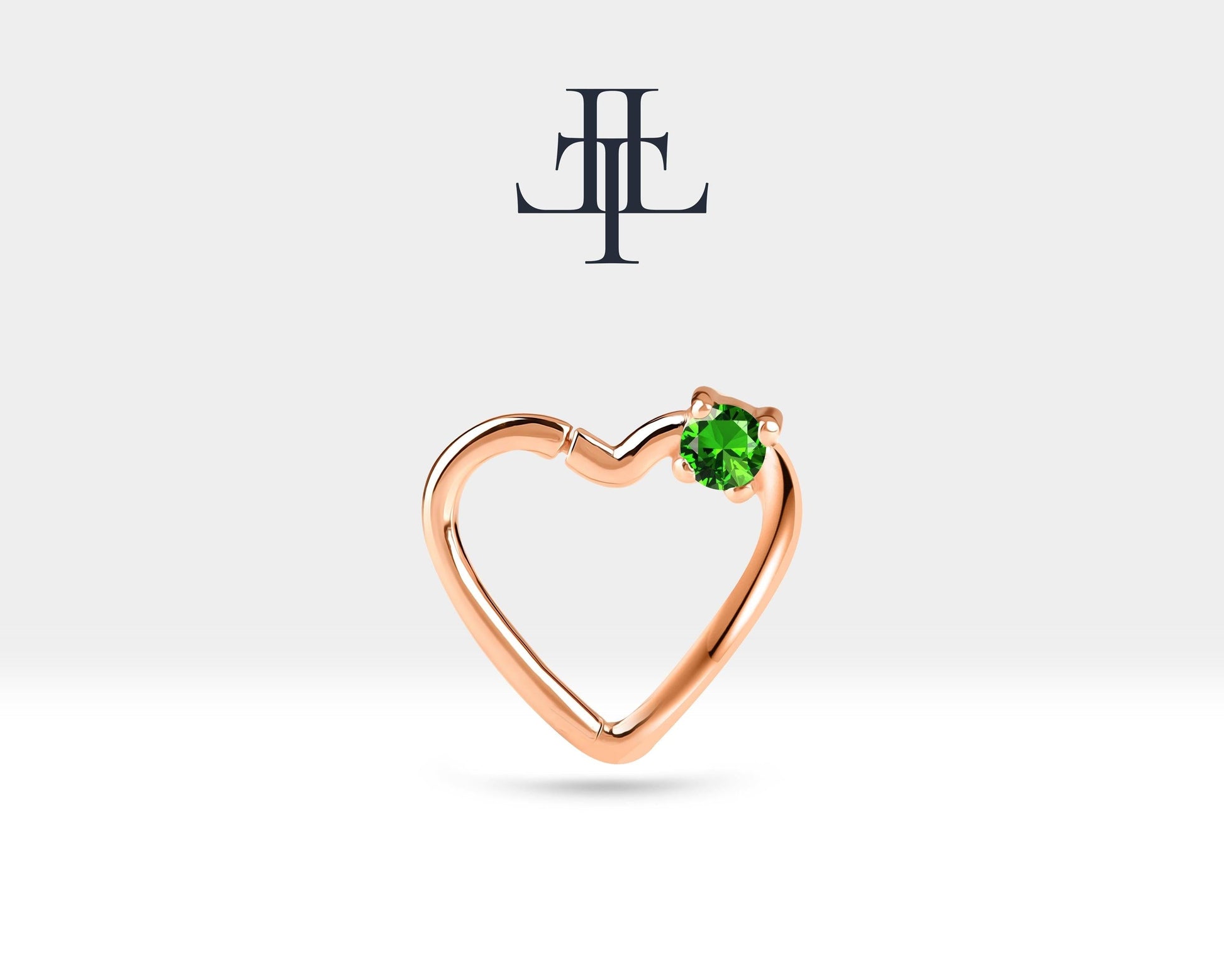 Tek Taş Kalp Yeşil Garnet Halka Piercing, 13 MM , 1.2 MM, 14K Sarı-Beyaz-Kırmızı Altın | LC00010G